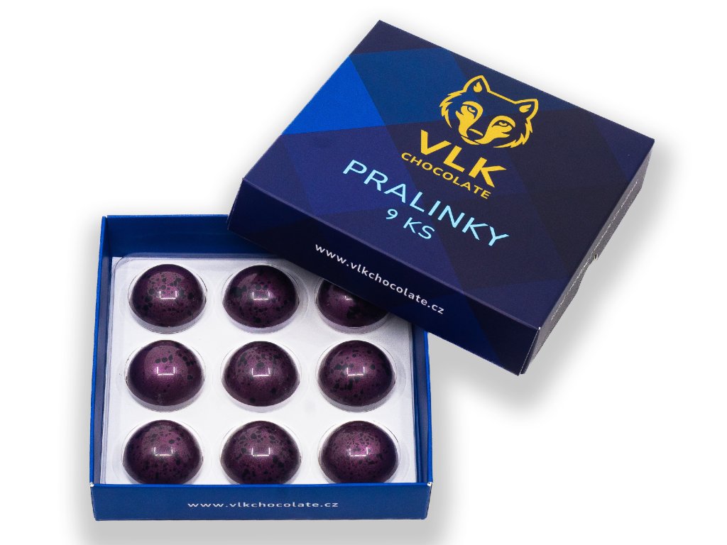 Pralinky jsou uložené v elegantní dárkové krabičce VLK CHOCOLATE — ideální jako dárek nebo jako jednodruhová kolekce ovocných pralinek.