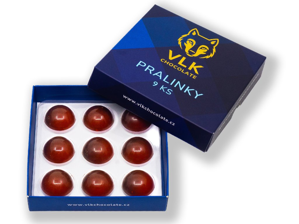 Pralinky jsou uloženy v elegantní dárkové krabičce VLK CHOCOLATE — ideální jako dárek i jako jednodruhová ovocná kolekce.
