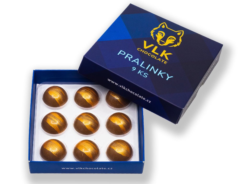 Pralinky jsou uloženy v elegantní dárkové krabičce VLK CHOCOLATE — ideální jako dárek i jako sada pro milovníky arašídových pralinek.