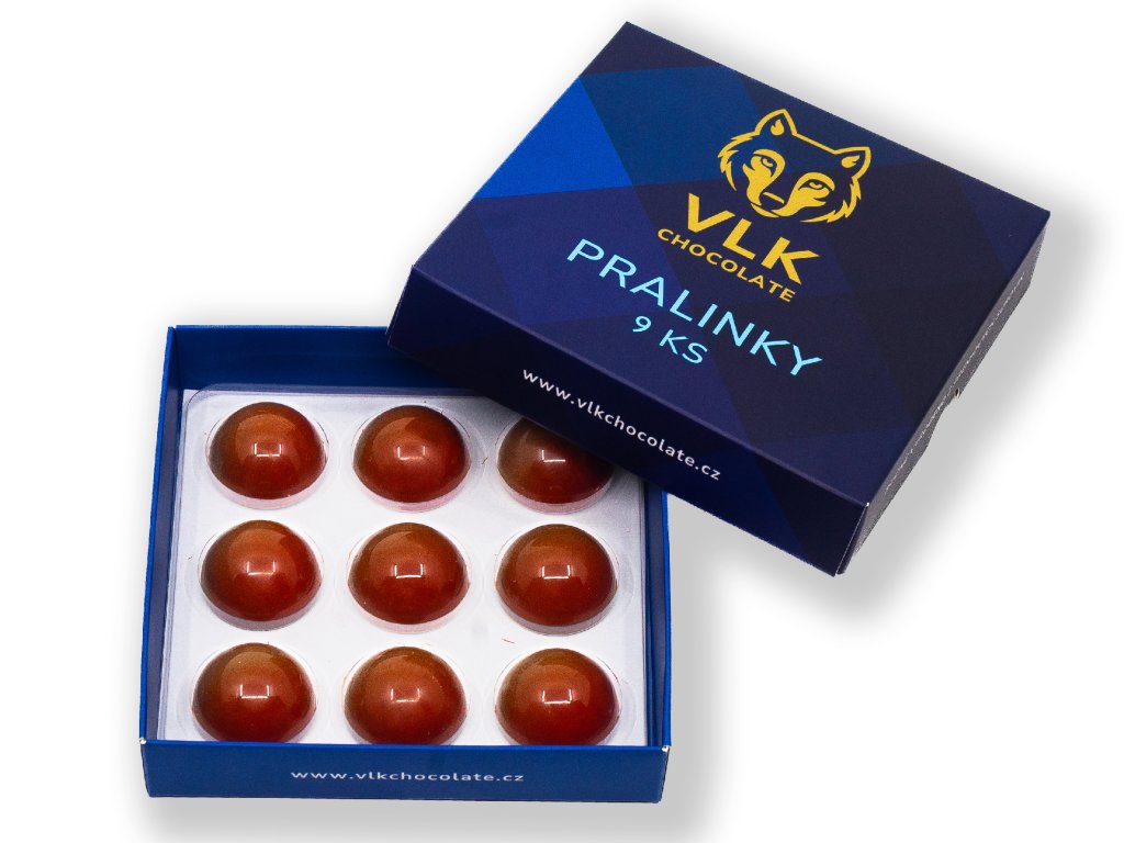 Pralinky jsou uloženy v elegantní dárkové krabičce VLK CHOCOLATE — ideální jako dárek nebo jednodruhová kolekce pro milovníky ovocných chutí.