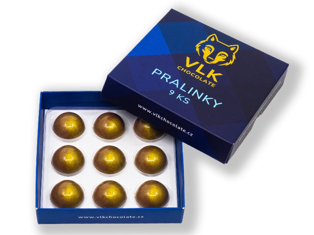 Pralinky jsou uloženy v elegantní dárkové krabičce VLK CHOCOLATE — vhodné jako dárek i jako ochutnávka jednoho oříškového druhu.